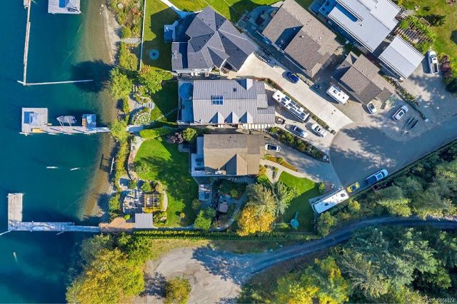Our neighbours on the left of our house have decided to list their house. They own both lots so will build a new "retirement" house on the extra lot splitting the property into two. All of the outdoor buildings, shed, dining gazebo and outdoor kitchen, including their dock are all on the extra lot so they will not lose anything. Should be interesting for them. Glad they are not actually leaving. :) Here are some drone pictures that they took for their listing that also show our house and location. At the moment we are lot #7 and their house is on lot #8 with lot #9 as their extra one close to the park. These pictures really show how close our houses are to each other but when you are in them we are all screened pretty well from our neighbours with the house placements on the lots.